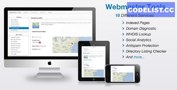 Webmaster Tools is lightweight and easy to install PHP Script which contains a collection of webmaster tools developed to help with their daily chores. The application have 19 built-in unique services which can be easily configured to your own needs.
